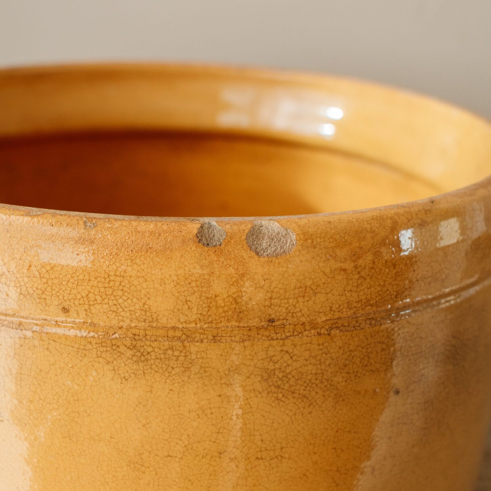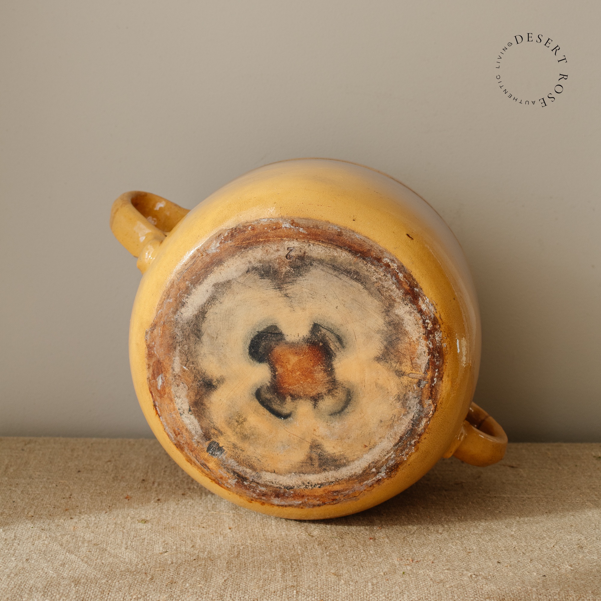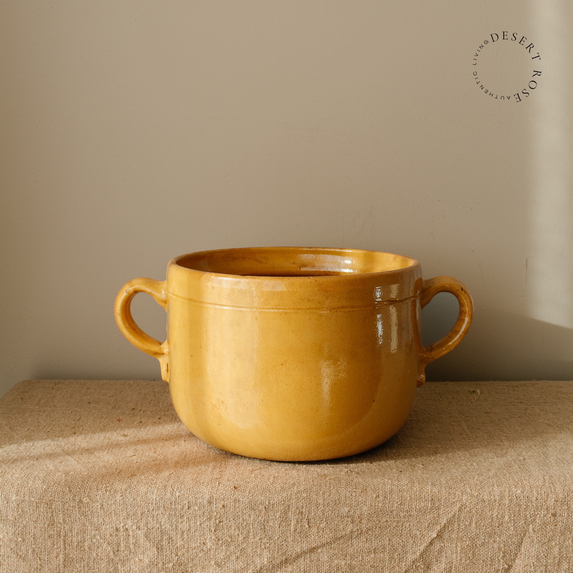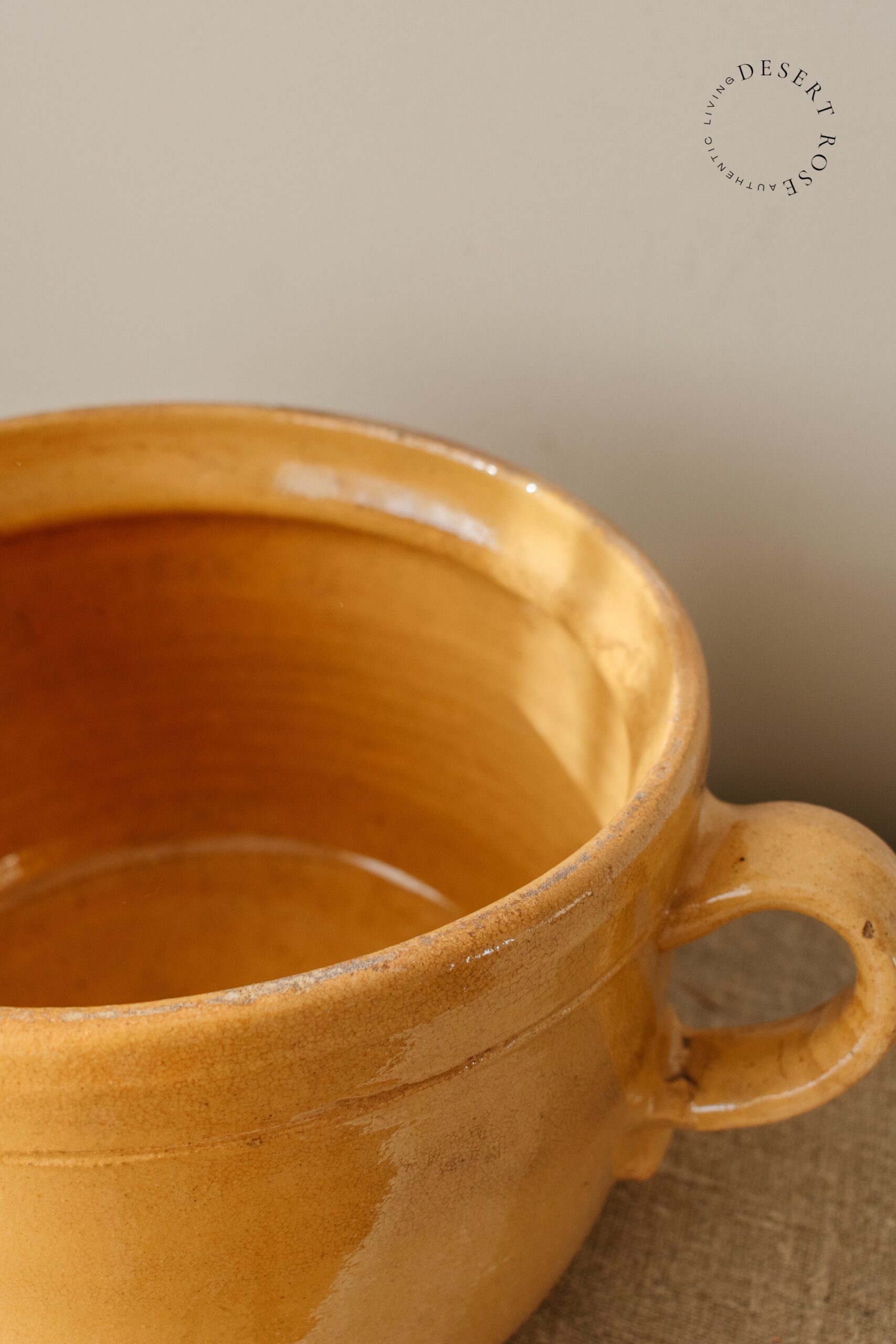 Deze vintage Franse gele pot is een prachtig rustiek item met een rijke geschiedenis. Gemaakt van stevig steengoed in een warme okergele glazuurlaag. De onderkant, met sporen van gebruik, suggereert dat hij oorspronkelijk als kookpot werd gebruikt in traditionele Franse keukens. De stevige handvatten maken het niet alleen praktisch, maar ook een decoratieve blikvanger.