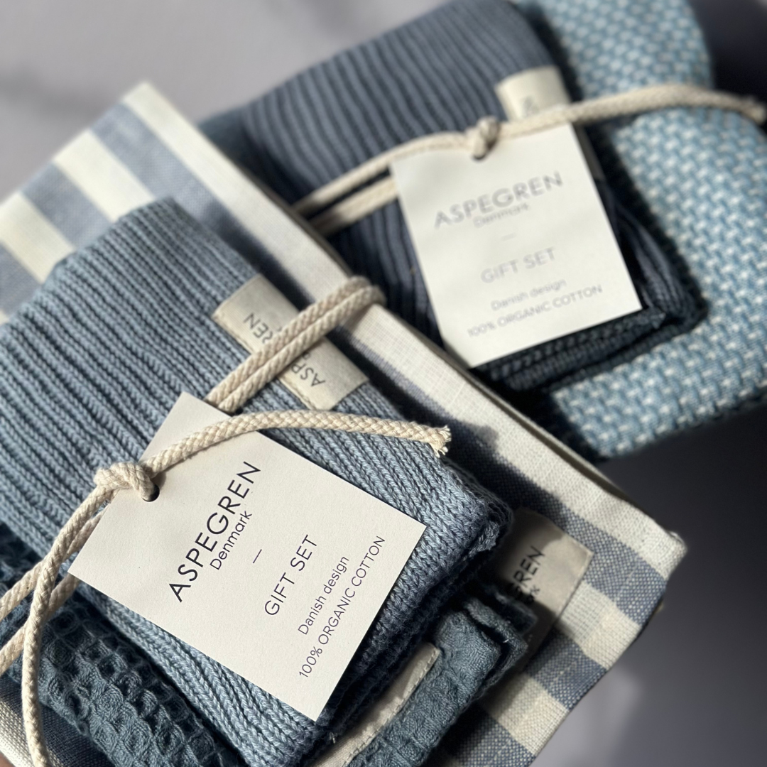 Een duurzame keukenset bestaande uit één theedoek en twee vaatdoekjes in een mooie blauwe kleur. Gemaakt van biologisch katoen, vrij van microplastics en schadelijke chemicaliën. We hebben in elk ontwerp de nadruk gelegd op eenvoud en Scandinavische elegantie. Deze sets vormen een prachtig cadeau-idee, zowel voor jezelf als voor degenen die je wilt verwennen. De cadeauset past prachtig in zowel klassieke witte, zwarte, grijze en houten keuken.