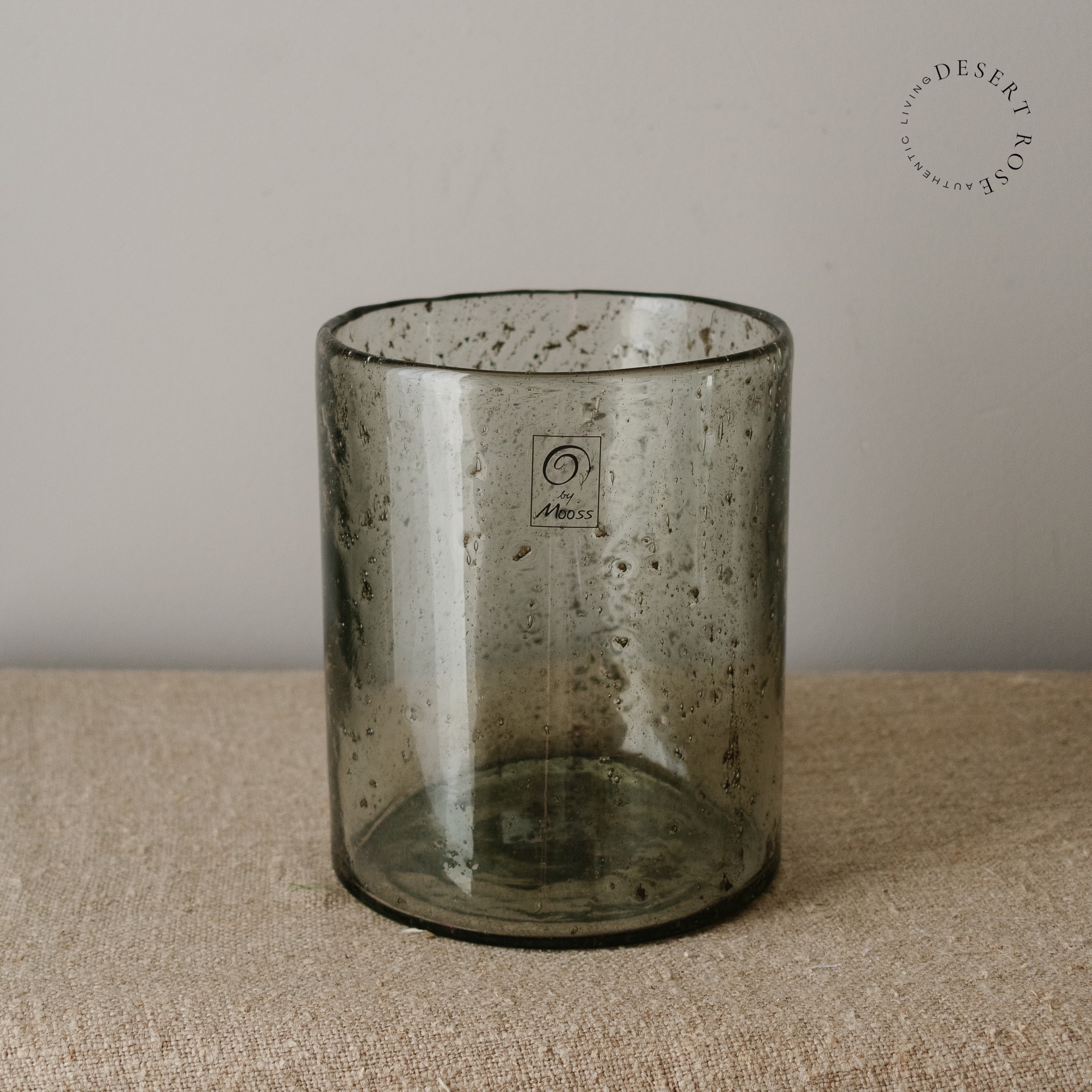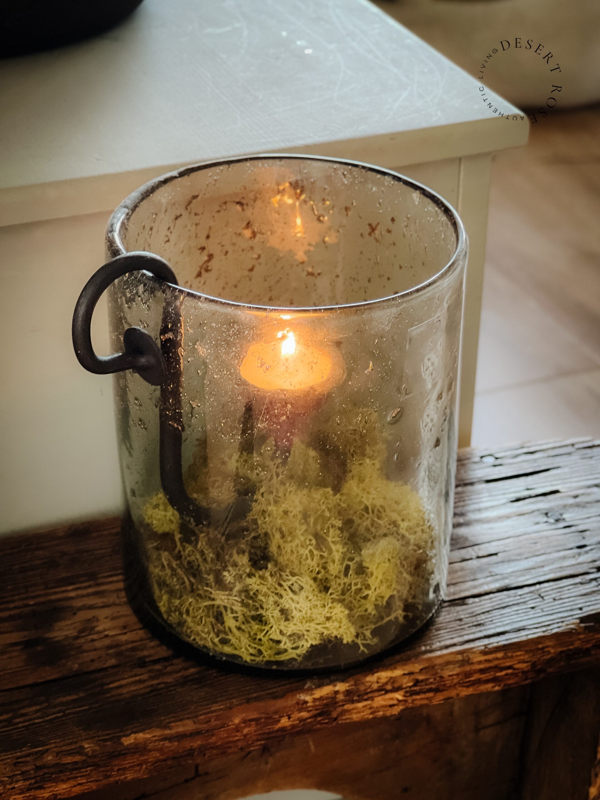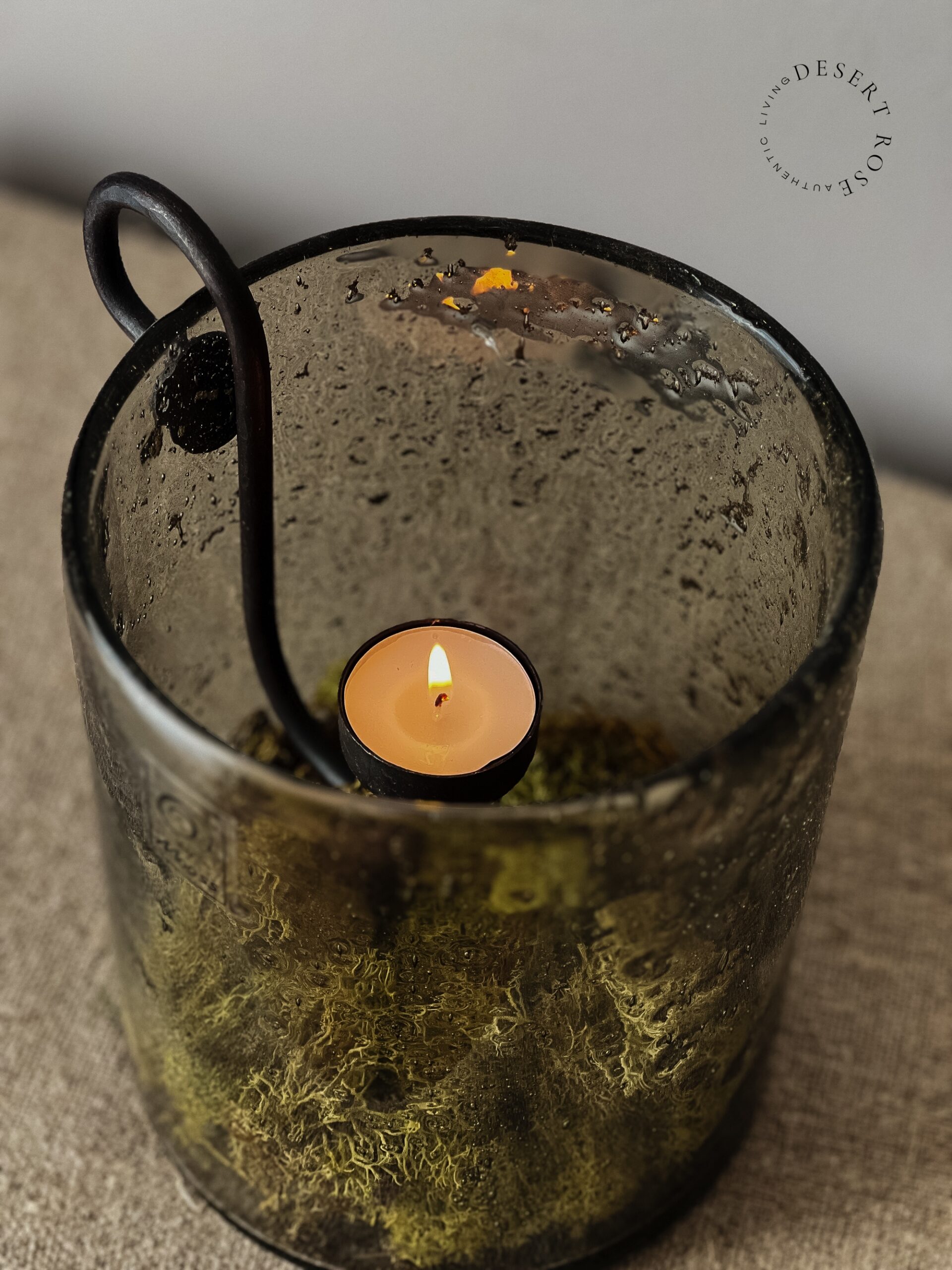 Het windlicht is gemaakt van mondgeblazen glas met subtiele oneffenheden en bubbeltjes, wat elk stuk uniek maakt. De zwarte metalen haak met houder biedt plaats aan een waxinelichtje dat zachtjes weerspiegelt in het glas, terwijl het mos aan de onderzijde een natuurlijk en warm accent toevoegt.
