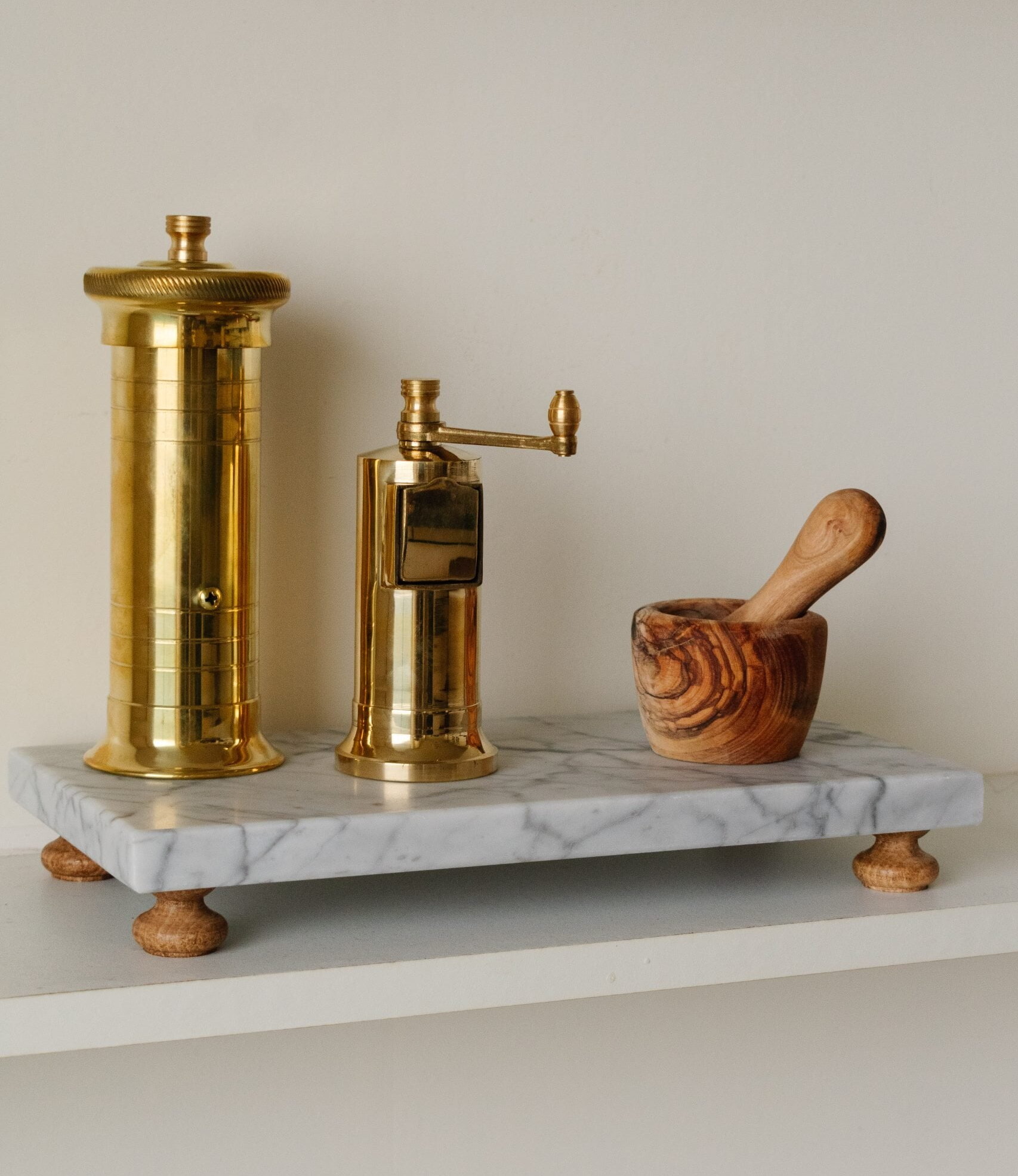 Handgemaakt in Nederland, een rechthoekig plateau van Carrara marmer dat al eeuwenlang geprezen wordt om de tijdloze schoonheid en luxe uitstraling. De houten pootjes geven de tray een meer vintage uitstraling.