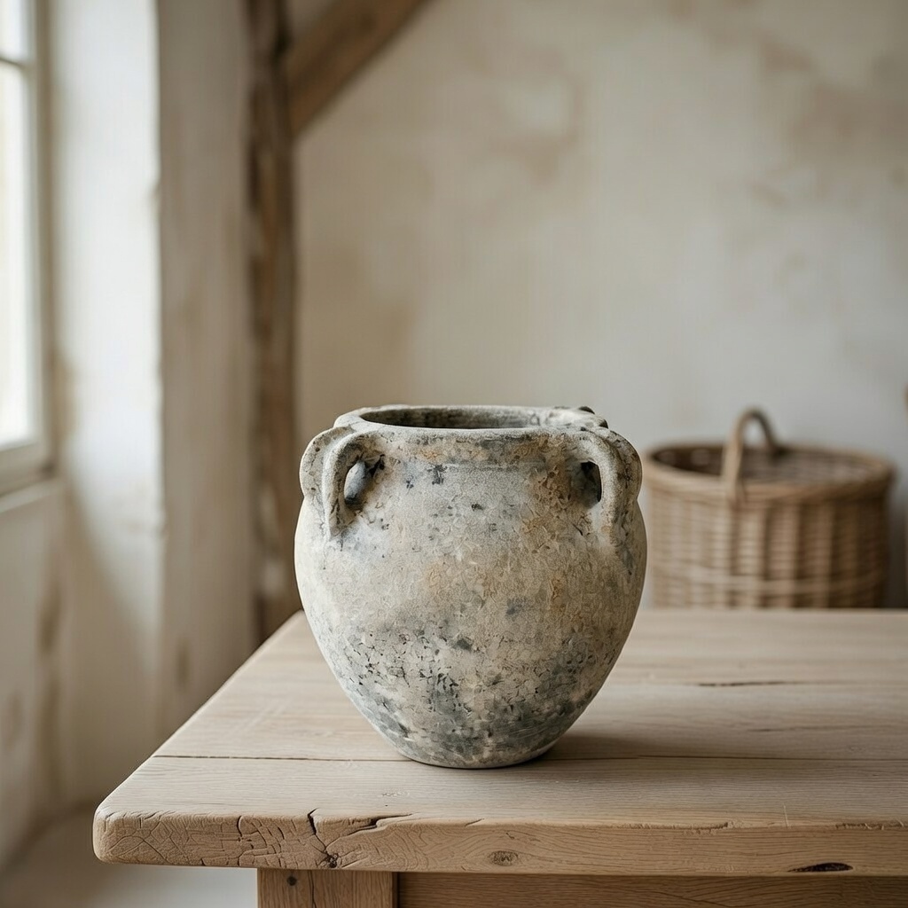 Authentieke handgemaakte amfora kruik met een rustieke, verweerde look en vier oren. Deze mediterrane aardewerk pot heeft een unieke craquelé structuur in warme aardetinten en een brede, organisch gevormde opening. Ideaal als eyecatcher in een landelijk, boho, wabi-sabi, Frans of mediterraans interieur. Perfect voor droge bloemen, pampasgras, olijftakken, eucalyptus of als pure decoratie. Door het ambachtelijke bakproces is elke vaas uniek – geen twee zijn precies hetzelfde. Prachtig op schouw, vensterbank, eettafel of in een boerenkeuken. Let op; niet geschikt voor water.