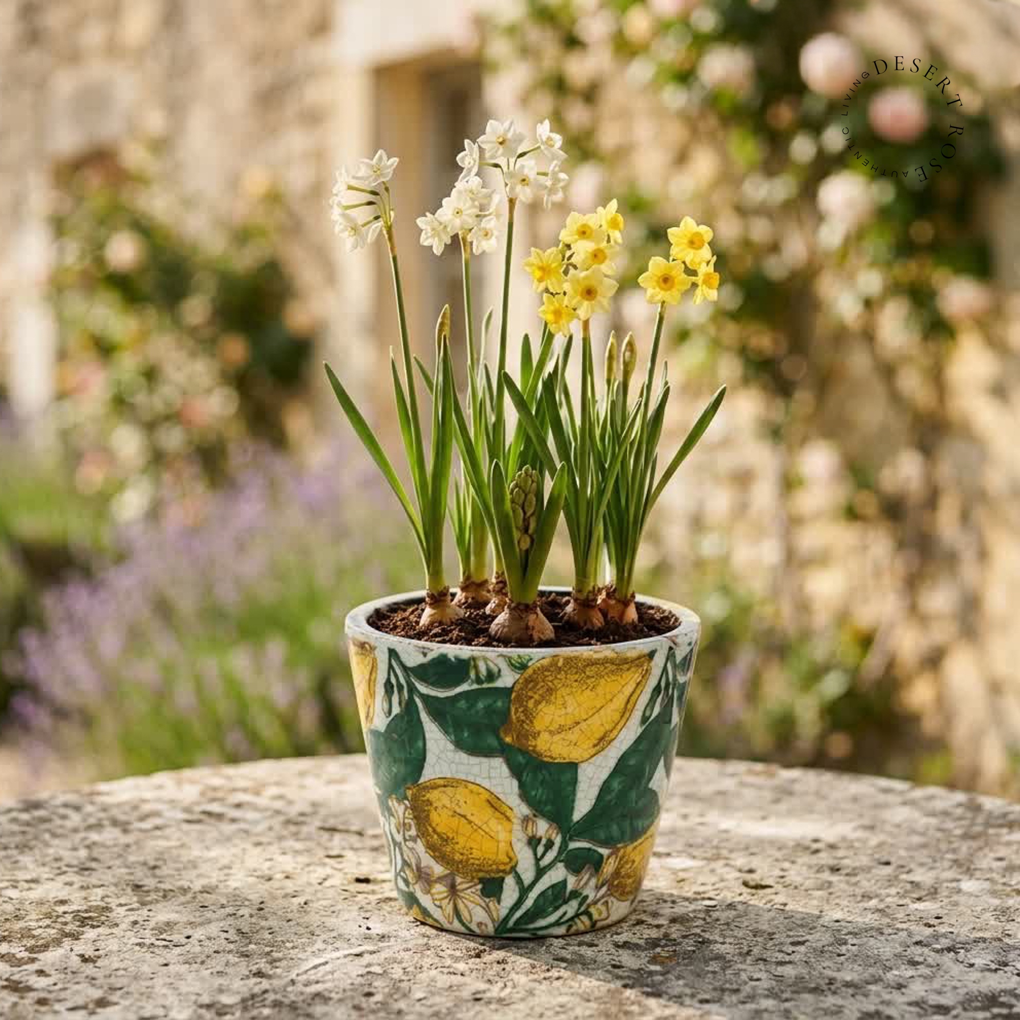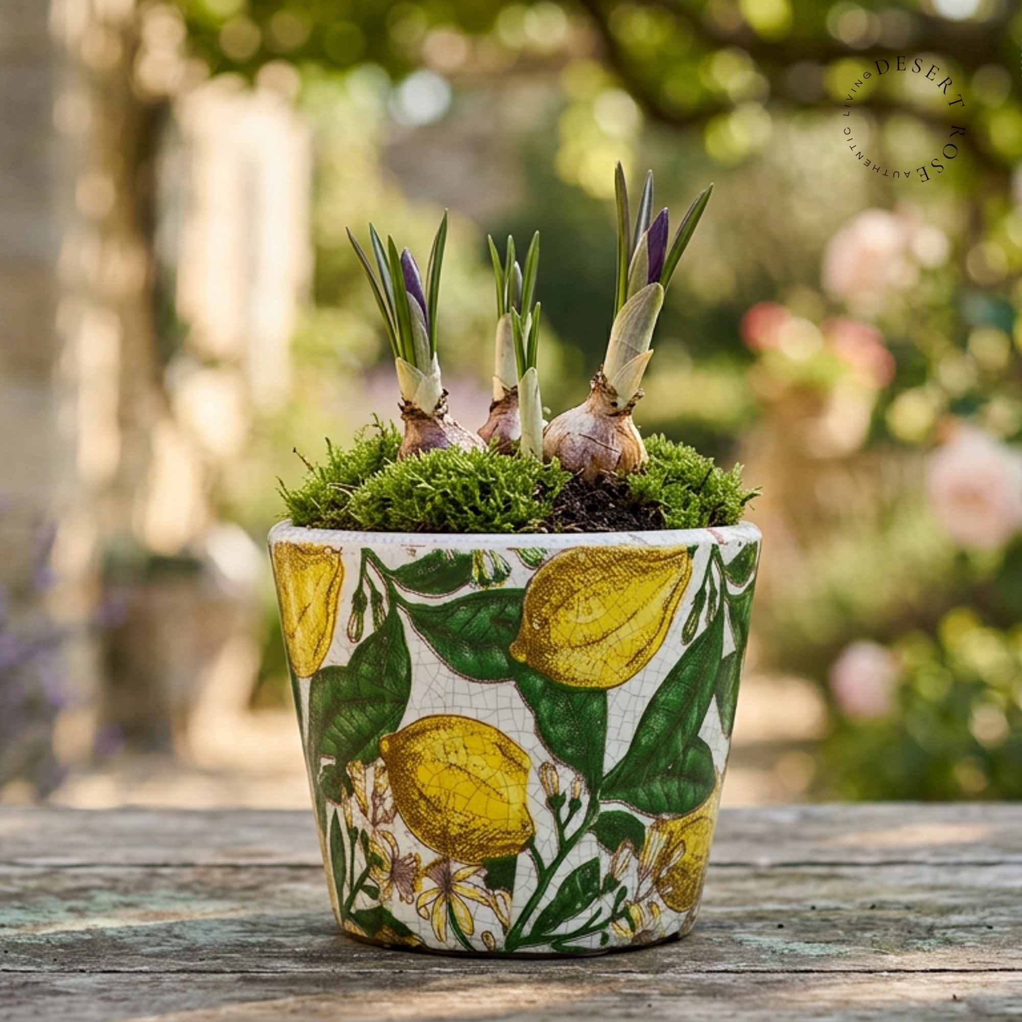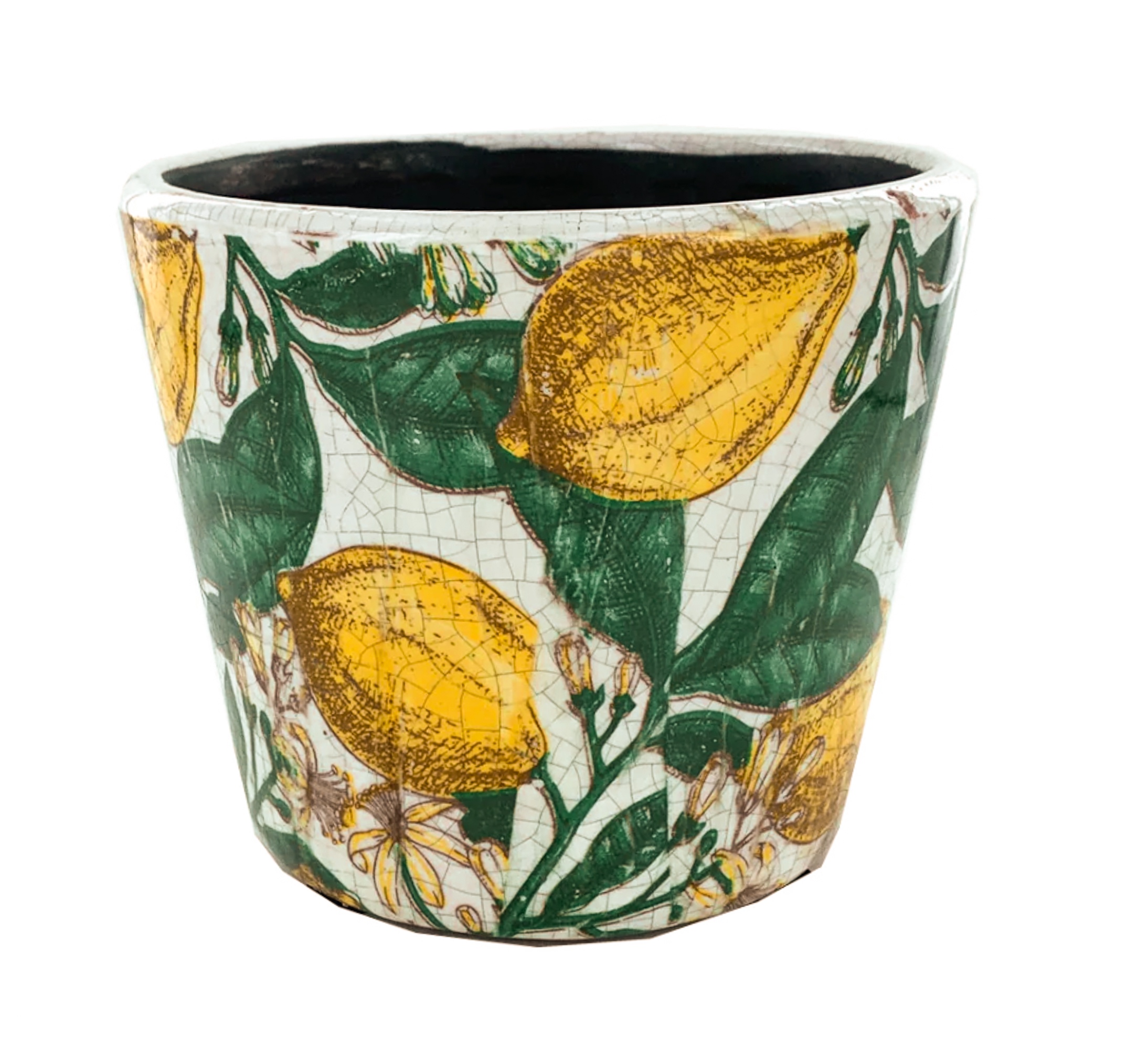 Breng de zon in huis of tuin met deze prachtige keramieken bloempot. Deze charmante bloempot is geïnspireerd op de weelderige citroengaarden van de Middellandse Zee en het rustieke Franse platteland. De pot is vervaardigd uit hoogwaardig aardewerk en voorzien van een karakteristiek ‘craquelé’ glazuur, wat de pot een authentieke, antieke uitstraling geeft.