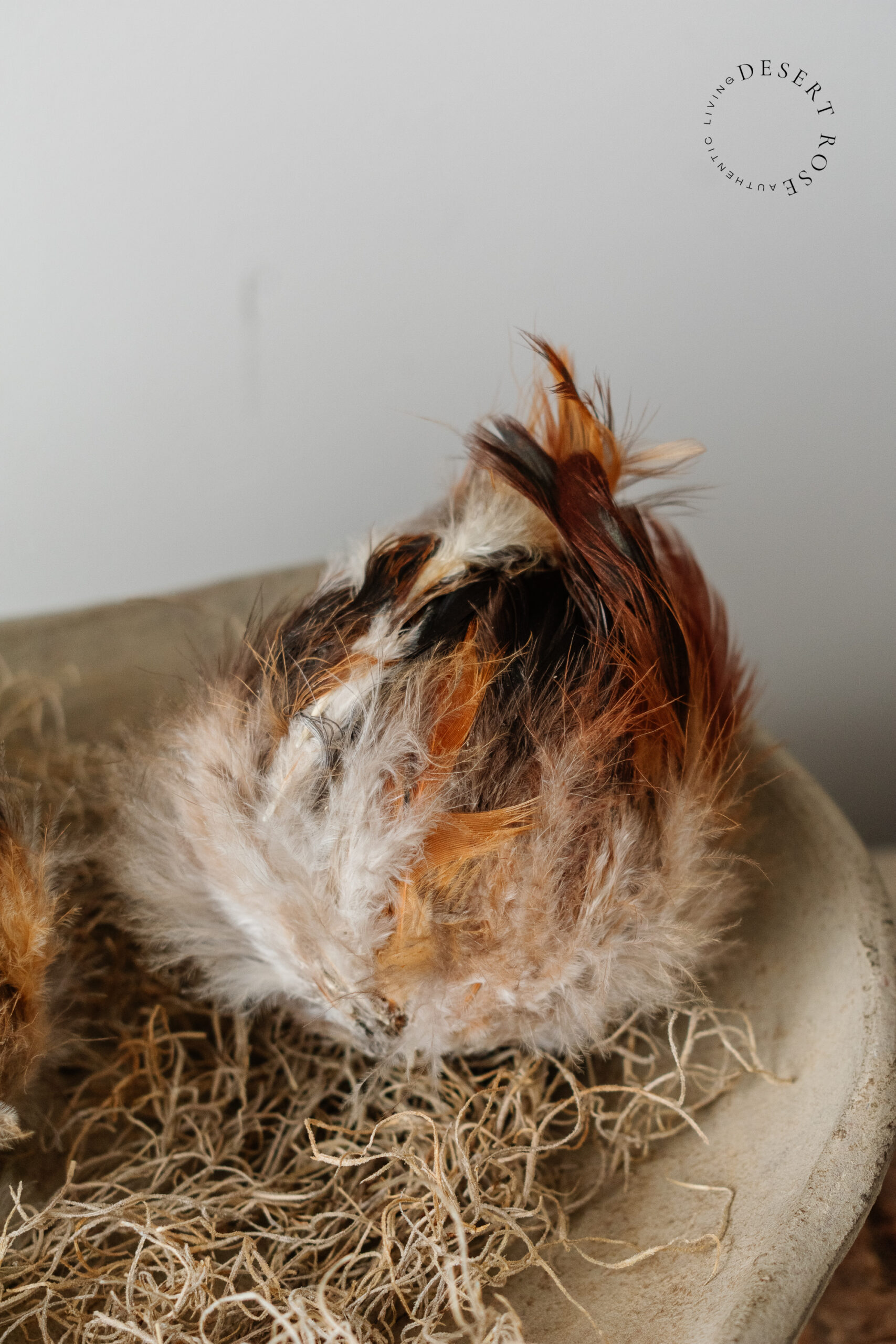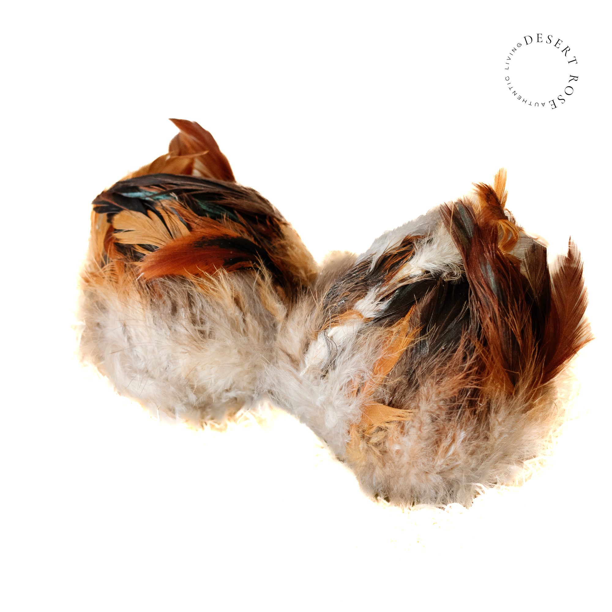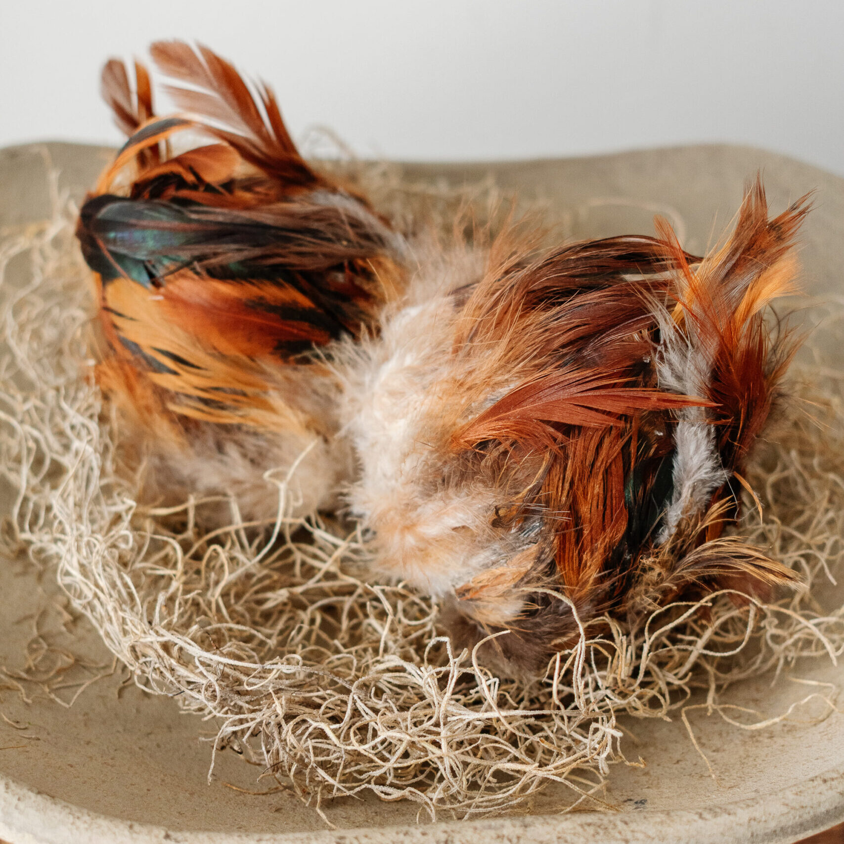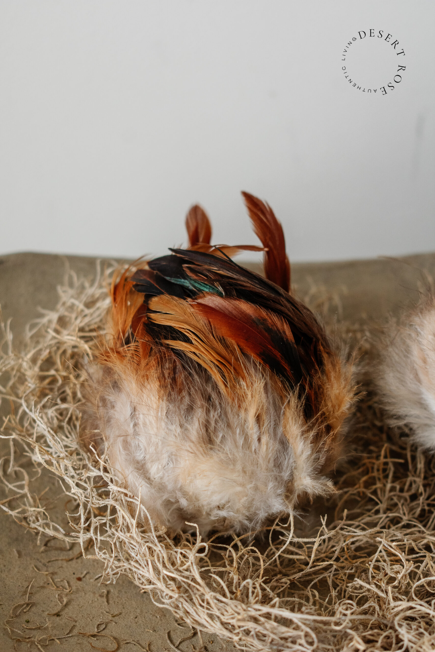 Vier de lente en Pasen met deze set van twee handgemaakte eieren van bruine en koperkleurige fazantenveren.