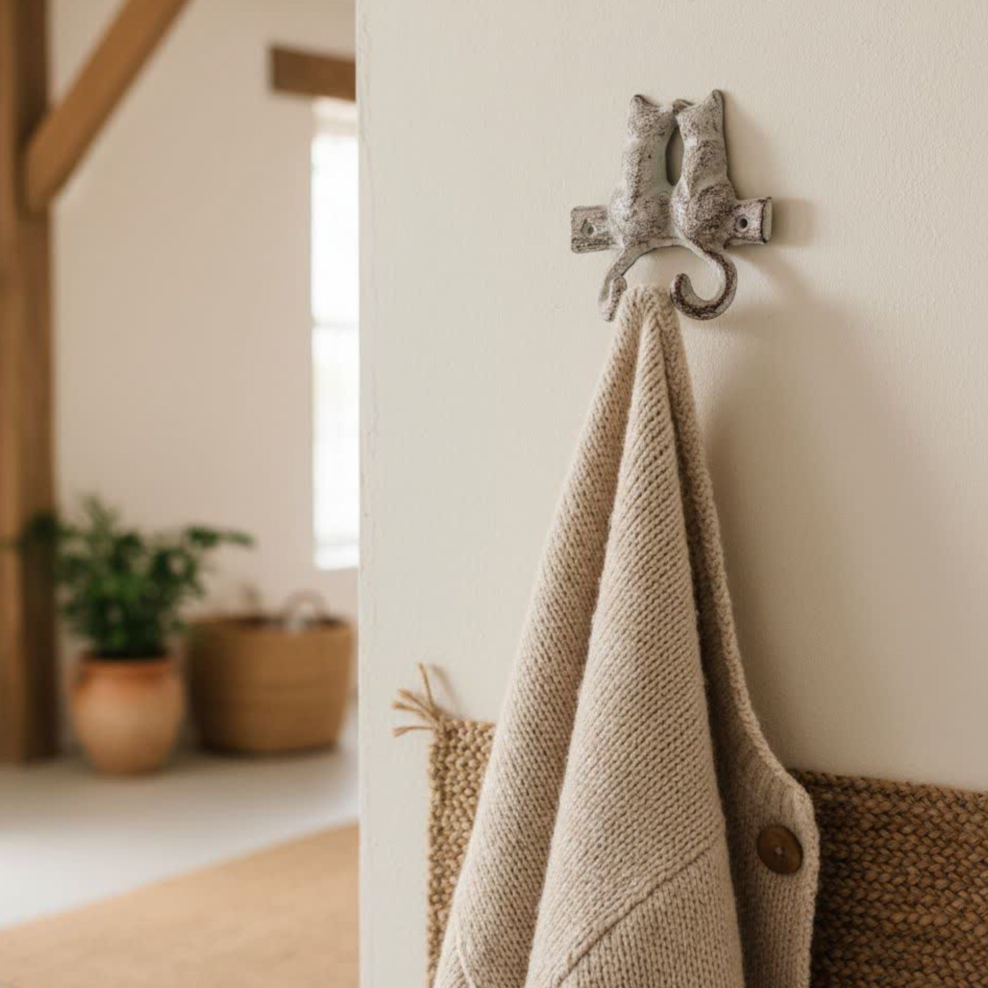 Een dubbele wandhaak van gietijzer voor alle kattenliefhebbers. Of het nu in de keuken is voor handdoeken of in de gang voor je jassen, deze zeven katvormige haken zorgen voor een nostalgische sfeer in je huis. Andere mogelijke toepassingen: voor handdoeken in de badkamer of als organizer voor al je sleutels. Geschikt voor binnen- en buitengebruik. De haakstrip kan door middel van twee gaten stevig aan de muur worden geschroefd (de schroeven worden niet meegeleverd).